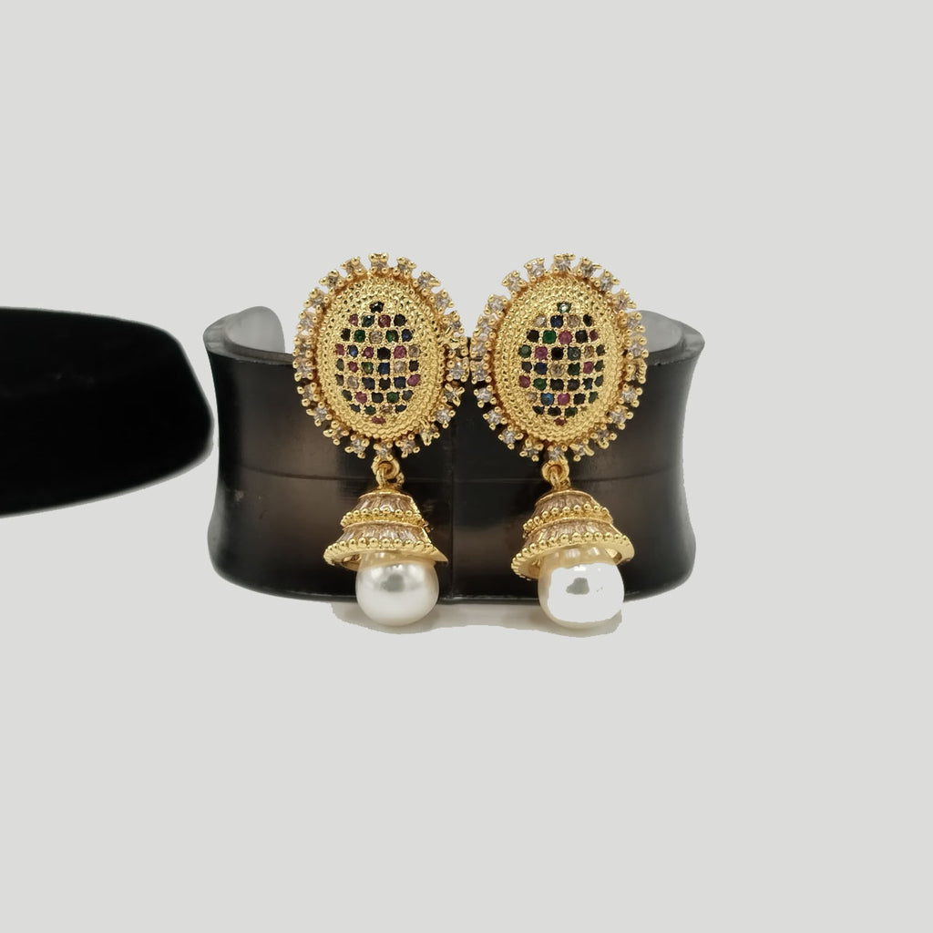 Elegant oval-shaped gold-toned stud earrings, detailed with shimmering stones and finished with a dome and pearl drop. A refined accessory for traditional and formal occasions.