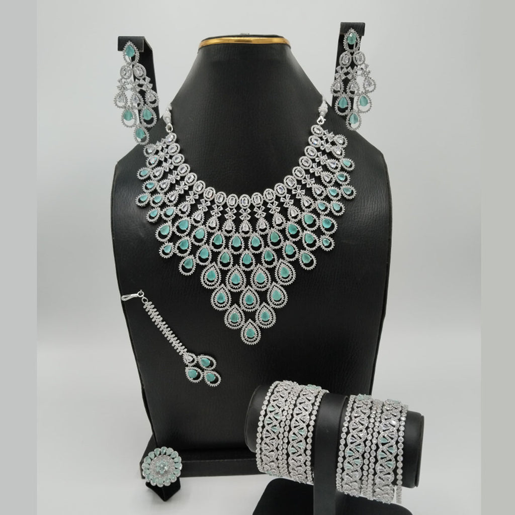 Indulge in timeless sophistication with our American Diamond Bridal Set, designed for modern brides who love a royal touch. This complete wedding jewelry set includes a long statement necklace, matching earrings, ring, and maang tikka, all adorned with green and white...