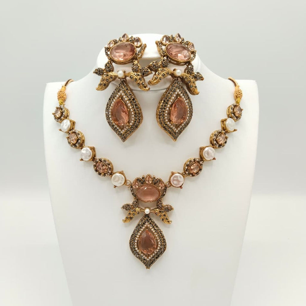 Elevate your bridal look with this antique gold plated jewelry set featuring pink stones, pearls, and intricate detailing. Perfect for weddings and festive occasions, this timeless necklace and earring set blends tradition with elegance, adding royal charm to your style.