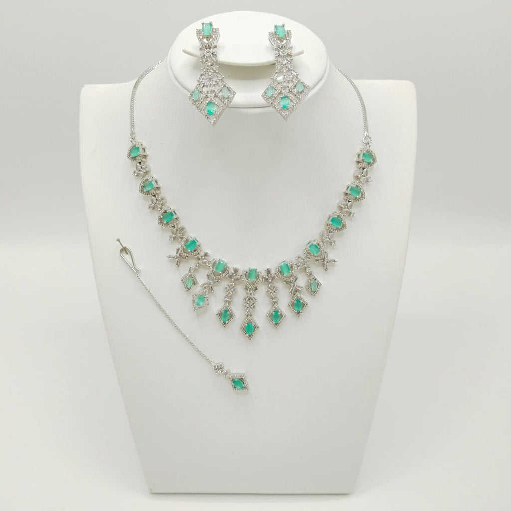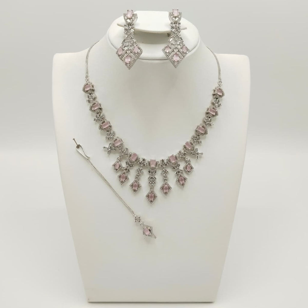 Add charm to your bridal look with this silver plated necklace set featuring sparkling pink stones and earrings. Perfect for weddings, receptions, and festive occasions, it blends elegance with timeless beauty.