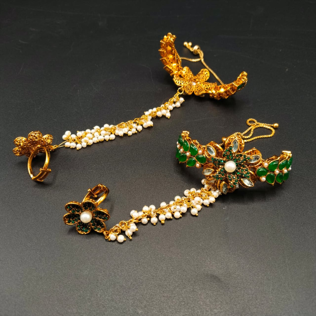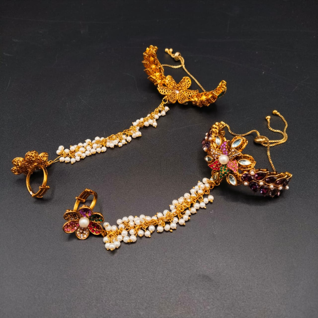 Add effortless charm to your bridal or boho look with this Elegant Floral Hand Chain Bracelet, beautifully adorned with multi-color stones and delicate pearl accents. Designed in a graceful slave bracelet (hathphool) style, it connects a floral finger ring to a matching bracelet for a timeless and feminine finish.
