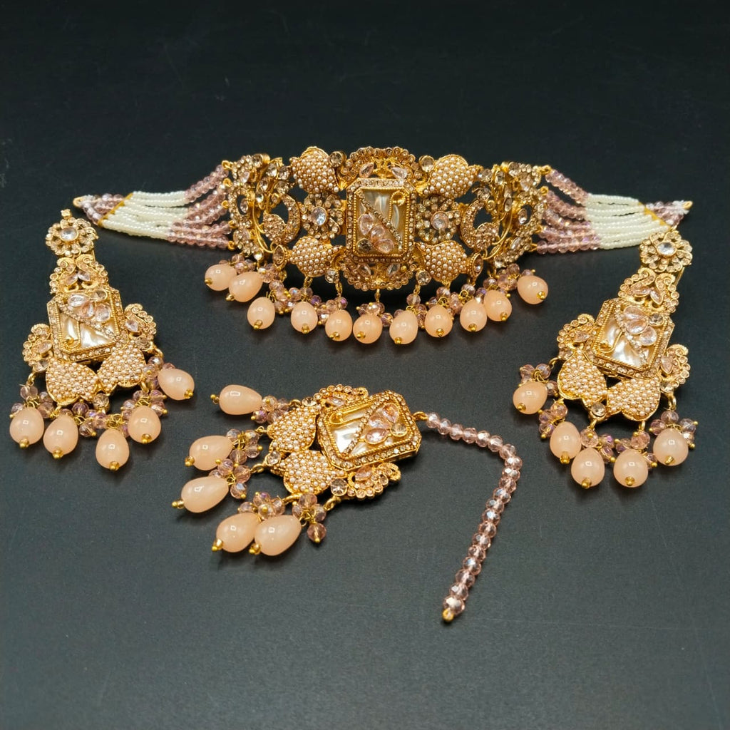 Turkish Antique Choker Jewelry Set with Maang Tikka & Earrings - Traditional Ethnic Necklace in Mint, Pink, Peach, & Black