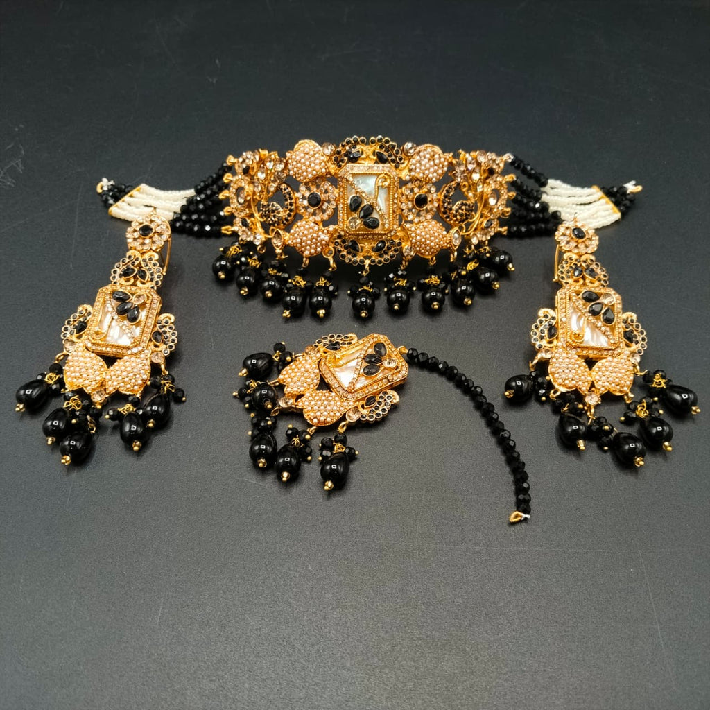 Celebrate timeless bridal beauty with this Traditional Bridal Choker Set, a majestic 5-piece antique gold-tone wedding jewelry ensemble inspired by classic South Asian bridal heritage. This luxurious set includes a richly detailed choker necklace, elegant earrings, a traditional maang tikka,...