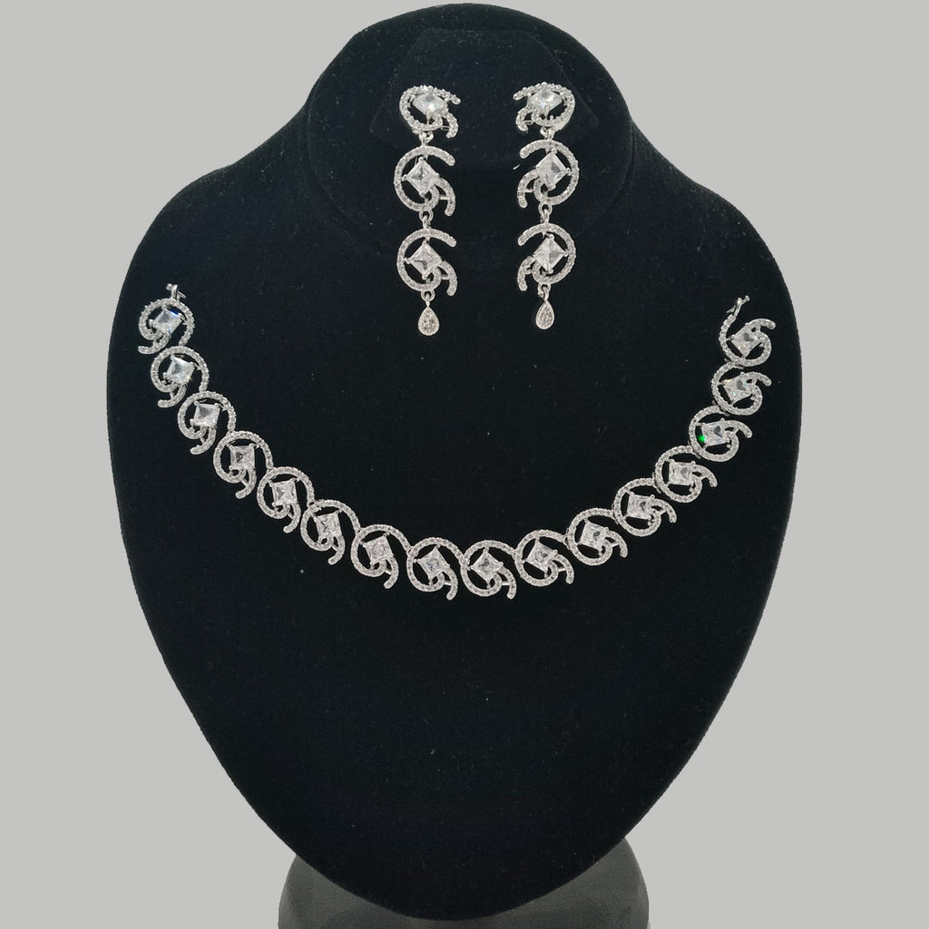 Add timeless elegance to your ensemble with this stunning rhodium-plated necklace and matching earrings set. Embellis...