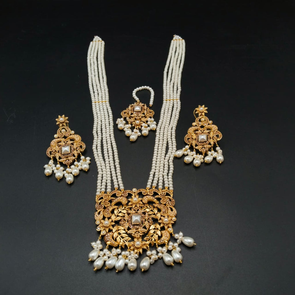 Step into royal elegance with this Royal Kundan Mala Jewelry Set, a luxurious traditional 5-layer long necklace (Rani Haar) crafted for grand bridal and wedding occasions. This exquisite set features a beautifully designed kundan mala necklace, complemented by matching earrings and an ornate maang tikka, creating a complete regal bridal look.