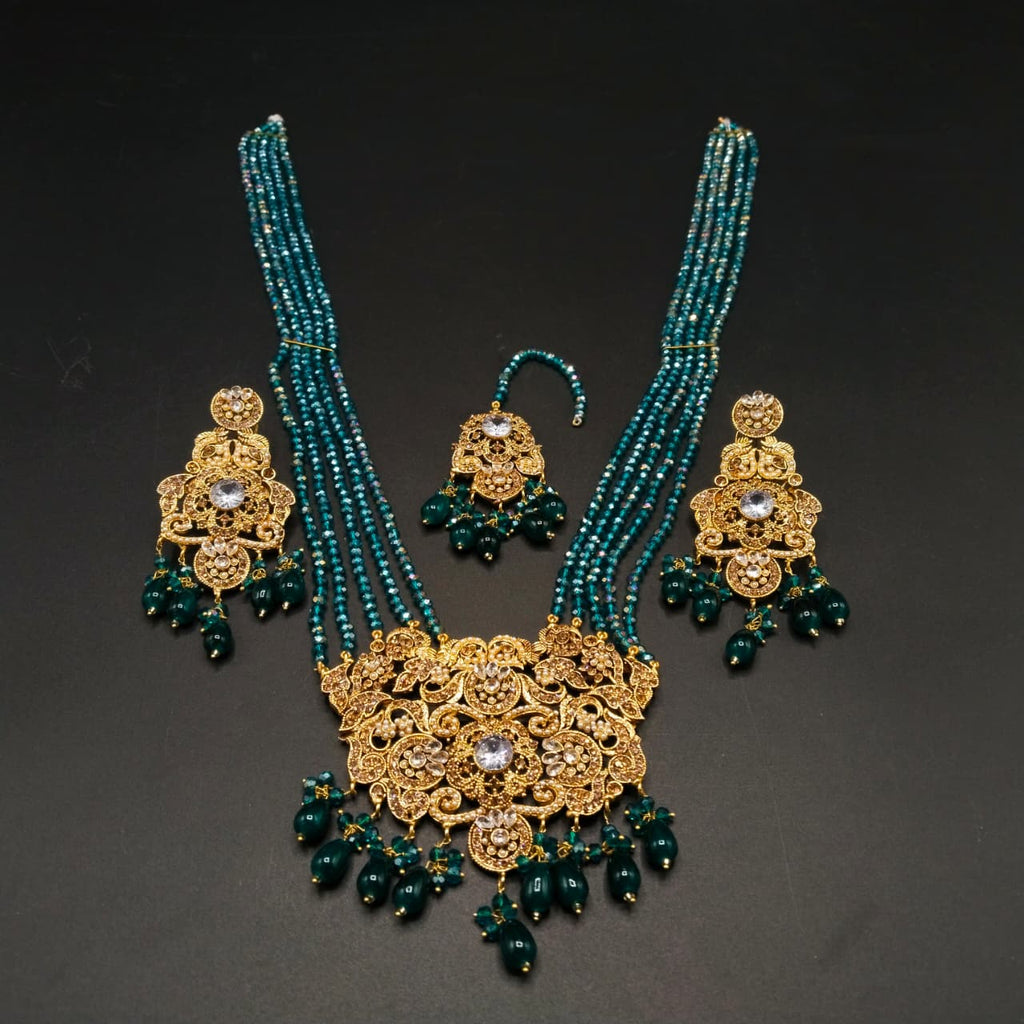 Adorned with high-quality kundan stones and finished with intricate detailing, this bridal jewelry set delivers a luxurious look ideal for weddings, nikkah, baraat, walima, mehndi, receptions, and festive occasions. The traditional mala-style design adds grandeur and sophistication to lehengas, sarees, and heavy bridal outfits.